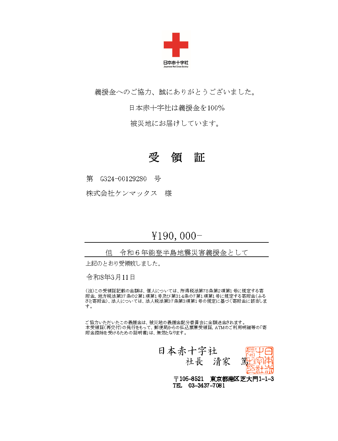 被災地義援金の受領証がダウンロードできましたのでご報告いたします。