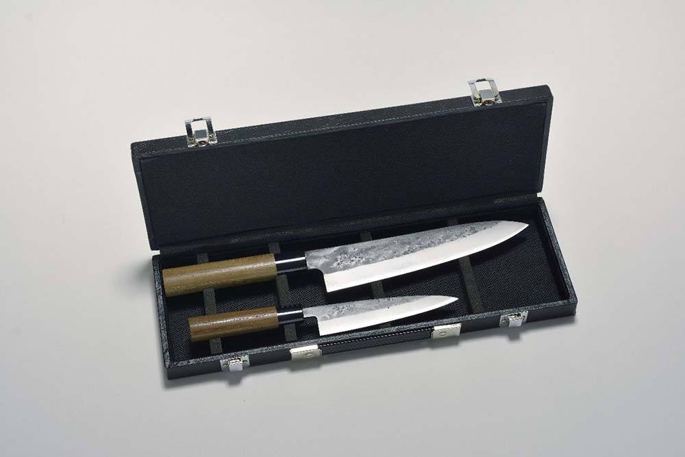 The knives in this set feature a three-layer construction of high-hardness carbon steel (Blue Steel #2) and stainless steel. This gift set includes a 210 mm Gyuto (chef’s knife) and a 135 mm petty knife, plus a wooden hard case valued at 4,500 yen, making the set an extraordinary value.
